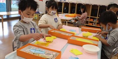 折り紙を使い、角を合わせながら丁寧に折りました。