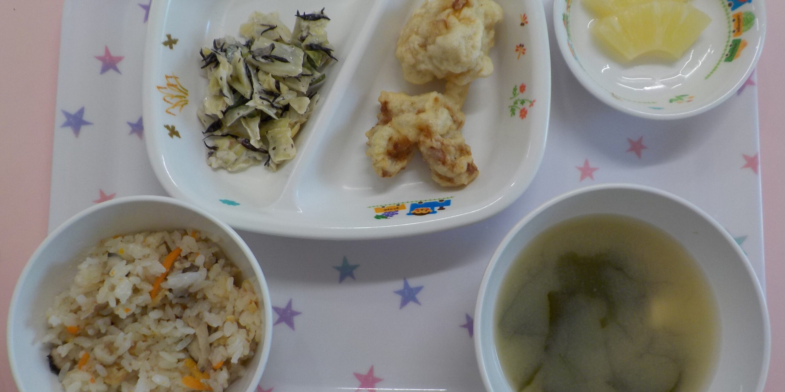 4月192021あおぞら給食 <給食> ・鶏天 ・キャベツとひじきの和風コールスロー ・じゅーしー ・味噌汁 ・パイン <おやつ> ・牛乳 ・お麩ラスク Category: あおぞら給食2021年4月19日 Share this post Share on FacebookShare on Facebook Share on XShare on X Post navigationPreviousPrevious post:4月17日(土)NextNext post:4月19日(月)Related posts11月22日(土)2025年11月22日11月21日(金)2025年11月21日11月20日(木)2025年11月20日11月19日(水)2025年11月19日11月18日(火)2025年11月18日11月17日(月)2025年11月17日11月15日(土)2025年11月15日11月14日(金)2025年11月14日11月13日(木)2025年11月13日11月12日(水)2025年11月12日11月11日(火)2025年11月11日11月10日(月) ☆七五三メニュー2025年11月10日11月8日(土)2025年11月8日11月7日(金)2025年11月8日11月6日(木)2025年11月6日11月5日(水)2025年11月5日11月4日(火)2025年11月5日11月1日(土)2025年11月1日10月31日(金)2025年11月1日10月30日(木) ☆ハロウィンメニュー2025年10月30日10月29日(水)2025年10月29日10月28日(火)2025年10月28日10月27日(月)2025年10月27日10月25日(土)2025年10月25日