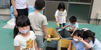 ご飯を食べ、園庭に行きみんなで、ゴーウヤの苗を植えました。(みんなでゴーヤを観察して、美味しくたべれるかな?)