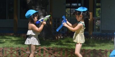水鉄砲をしたり、お友達と水のかけ合いをしたり