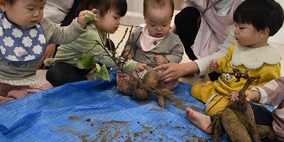 「ごつごつしてるね」「かたいね」「はっぱついてるね」と話し掛けると