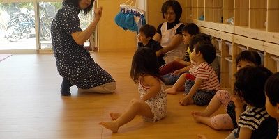 出てくるチョウチョと同じ色を子どもたちの洋服から探し、