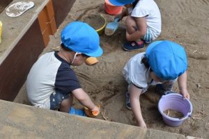 お砂場ではバケツにシャベルを使って砂を