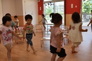 最初は、”曲が止まったら座る”がわからない子もいましたが、繰り返し遊ぶうちに上手になっていく子ども達。
