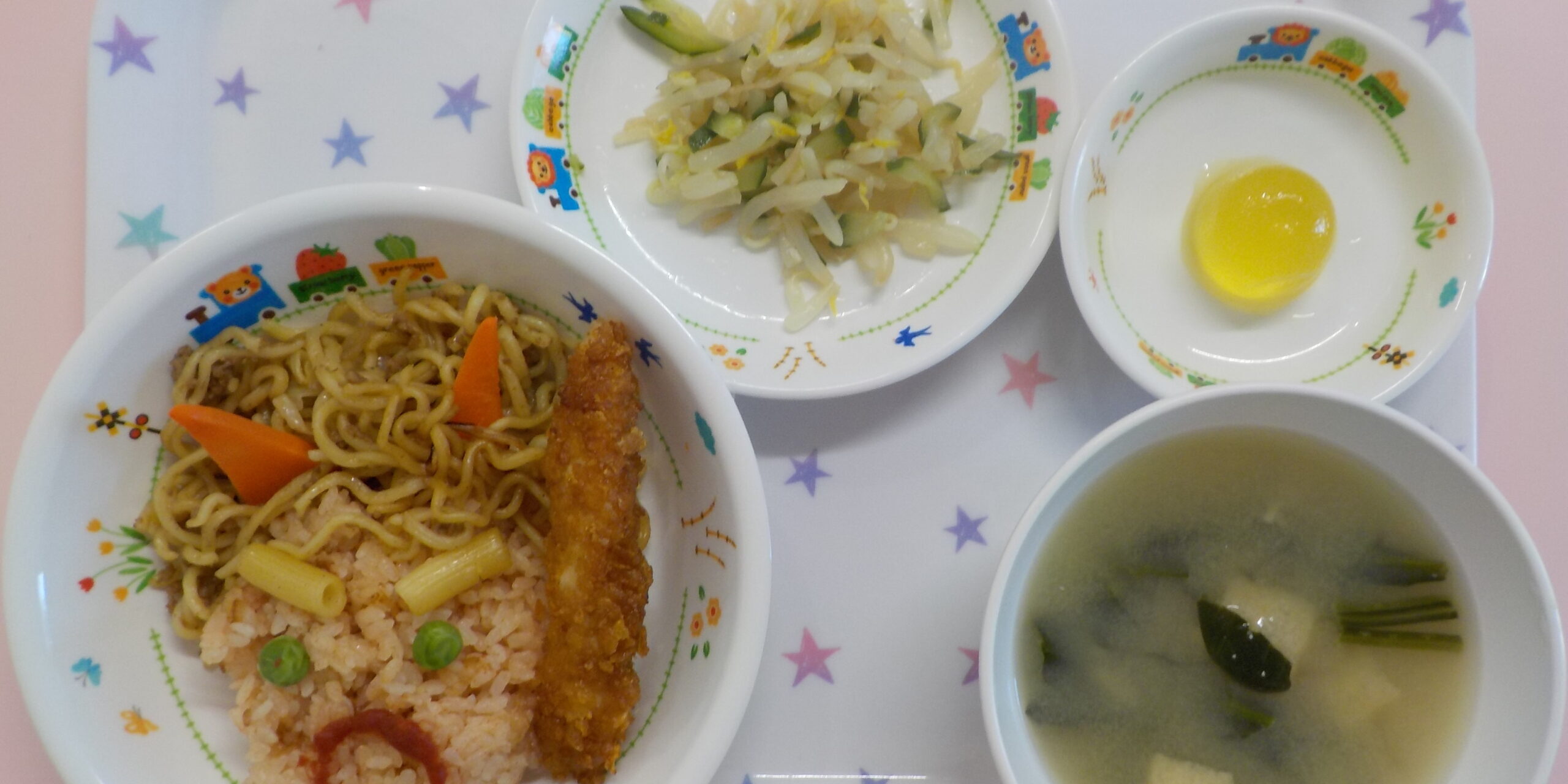 ケチャップライスと焼きそばで赤鬼👹、コーンフレークを使用して金棒に見立てたささみフライです。