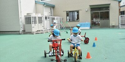 三輪車に乗ってコーンにぶつからないように上手に回れています!
