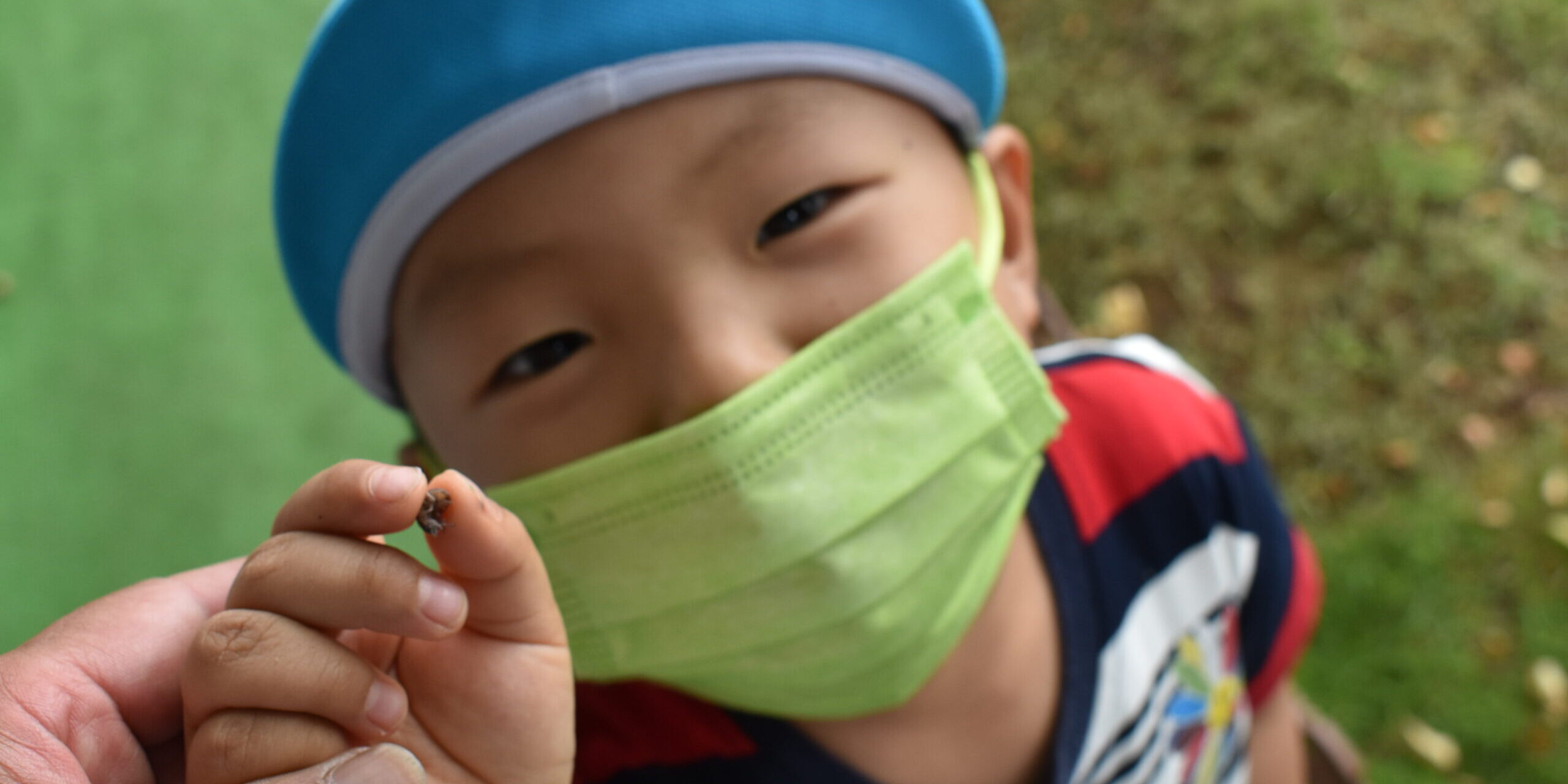 雨上がり、様子見ながら園庭に出ました、虫を見つけて