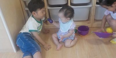 今日は、保育部と幼稚部合同で、水遊びをしたあと室内でブロックやおままごとをして遊びました。