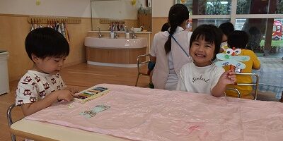 「水色メガネ!」「赤色メガネ!」などお友だちと会話を楽しみながら作ることが出来ました。