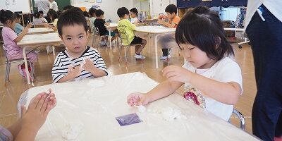 「先生みて!出来た!」の声や「手にくっついてうまく丸まらないよ」などの声が子ども達から聞こえてきます。
