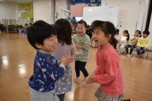 ピアノに合わせて元気に走ったり、お友だちと手を繋いでリズムを楽しみました。