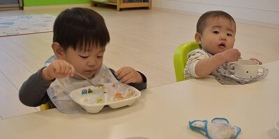 公園でたくさん遊んだあとは、おいしい給食の時間。上手にスプーンや手づかみで食べれるようになってきました。