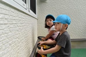 なでしこ組のお友達と一緒に三輪車に乗ったり