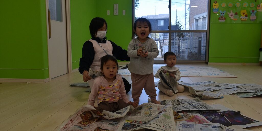 今日のこでまり組は、お部屋で新聞ビリビリをして遊びました。