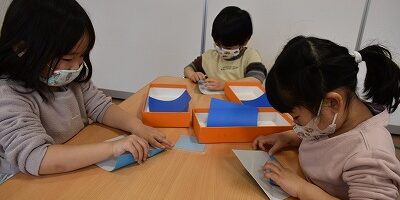 先生の話をよく聞いて頑張ってペンギンの折り紙を作りました。