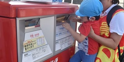 今日、幼稚部では、敬老の日に向けて、おじいちゃんおばあちゃんにお手紙をだしに行きました。