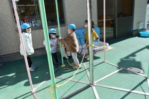 縄跳びで電車ごっこや、登り棒に縄跳びを括り付けて、「ここつかまった人のところね」「ここはくもの巣になってるの」と友達と会話を楽しみながらたくさん遊んでいました。