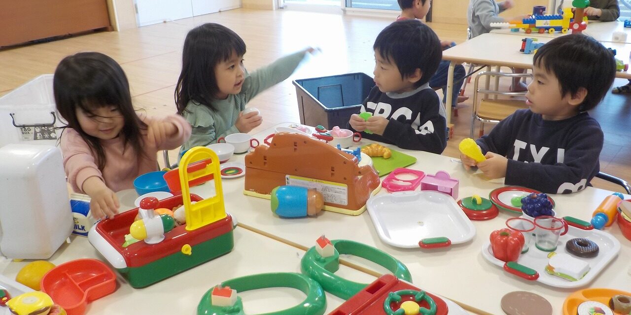 友達と一緒にテーブルでレゴブロックやおままごとをしました。
