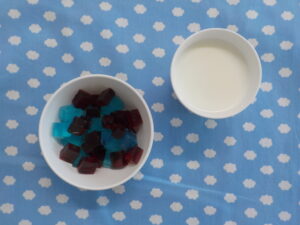 ☆おやつのゼリーも2種類のゼリーであじさいを表現し、季節感を出しました。