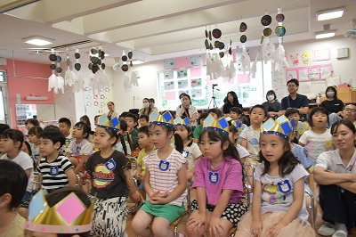 テルテル坊主やかたつむりなども出てきて「なんだろー」と考える子や「あ!かたつむりだ!」とすぐわかる子の様子なども見られ、楽しいお誕生日会になりました。