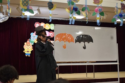 職員の出し物も子どもたちは嬉しそうにしてくれ、シルエットクイズで傘やお誕生日ケーキなどを見事に当てて楽しみました。