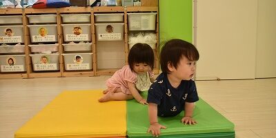 マットを広げると、みんなすぐに集まってきて、嬉しそうにマットの上をハイハイしたり歩いたり、とても活発に遊んでいました。
