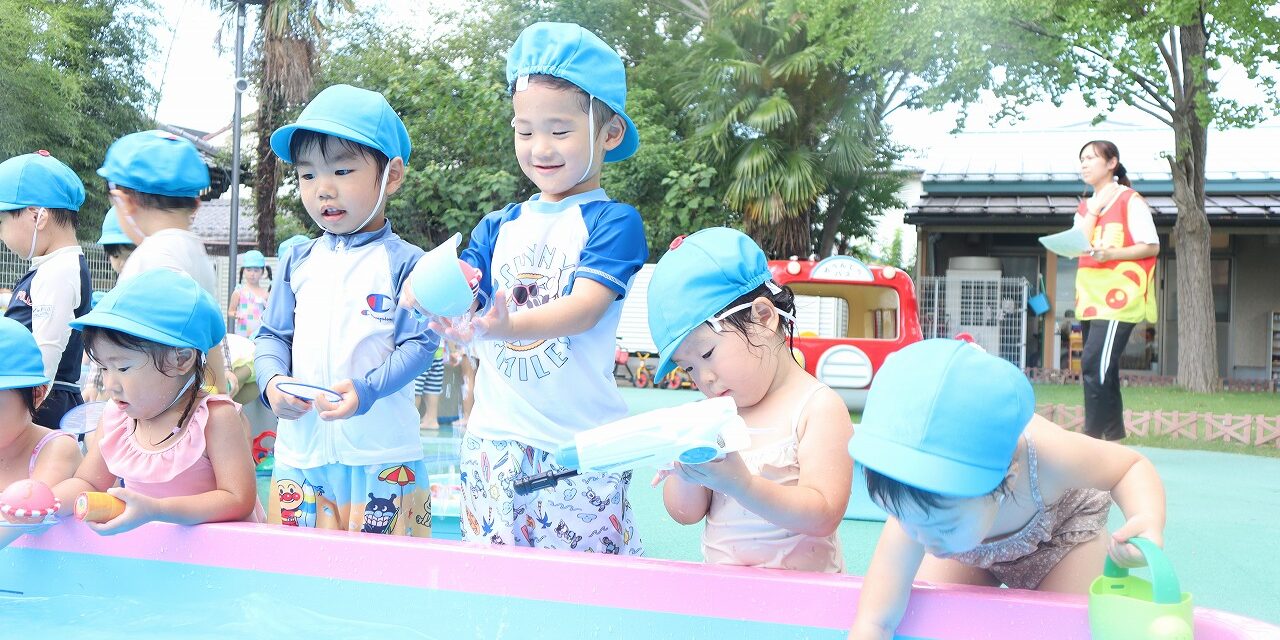 また、お友だちや保育者と水をかけあったりシャワーをしたりして楽しみました。