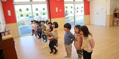 友だちと並んで元気な声で「おかえりのうた」をうたいました。