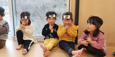 忍者が大好きなちゅーりっぷ組のお友だちは、「どんぐりにんじゃ」という絵本の忍者がしている額当てを付けてみんなで忍者になりきります!