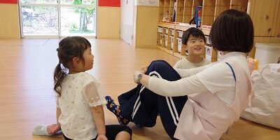 「どうぶつと言えば…?」と保育者が問いかけると、順番に「キリン」「ゾウ」などと言って保育者と一緒に連想ゲームを楽しみました。