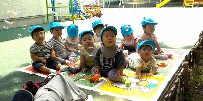 保育者が飛ばしたシャボン玉を興味津々に見たり、手で「パチン」とつかまえたりして楽しんでいました。