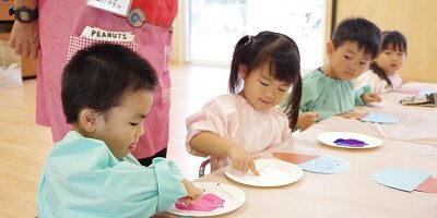 初めての絵の具を使ってお母さん指でペタンペタン。