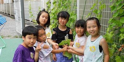 ひまわり組のみんなが育てているきゅうり、ゴーヤに毎日お当番さんが水を上げています。