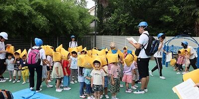 7月の避難訓練友だちと一緒に保育者の話をよく聞いて静かに移動することが出来ました。放送が聞こえるとテーブルの下に隠れて防災頭巾もしっかり被り、怪我無く落ち着いて避難しました。