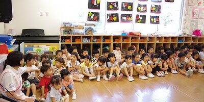 2歳児~5歳児までの子どもたちが幼稚部に集まり、盆踊りの練習をしました。