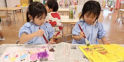 自分の考えた家を思い思いに描き、最後は絵の具で仕上げました。