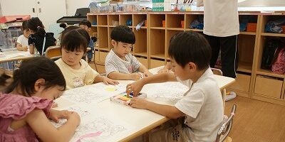 自分たちで好きなイラストを選んで色を塗り、お友だちと一緒に見せ合っています。