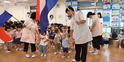 「たけのこ体操」を保育者と一緒に踊ったり「うんどうかいのうた」を元気に歌っていました。