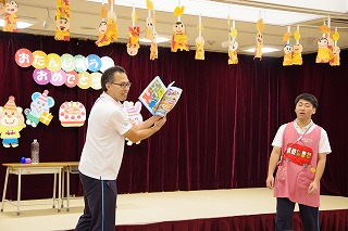 10月のお誕生日のお友だちが舞台へ上がり保育園のみんなからお祝いしてもらいました。