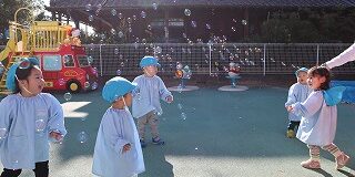 園庭では、みんなでシャボン玉を追いかけてたくさん体を動かして遊びました。