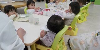 朝おやつの時間、保育者が「おいしいね」と話し掛けると、クリームサンドビスケットを喜んで食べていました。