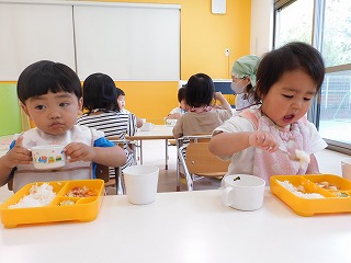 歩道をお散歩しました。「あじさい」「たんぽぽ」「ツツジ」色とりどりのお花に興味深々な様子でした。