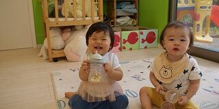 おやつの前に朝の会「おはよう~・おはよう~」とお歌をうたってから、一人一人エプロンをつけ「いないないば~」自分でできるようになりました。