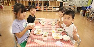 合同での給食では、ひまわり組さんとあじさい組さんが同じテーブルで食事をしました。