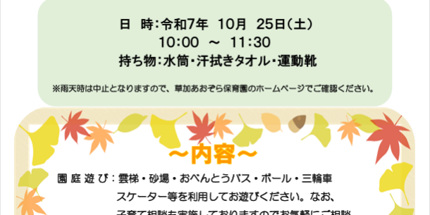 9月252025お知らせ URL:10月ポスター Category: お知らせ2025年9月25日 Share this post Share on FacebookShare on Facebook Share on XShare on X Post navigationPreviousPrevious post:9月25日(木)NextNext post:9月26日(金)Related posts第4回 園庭開放 12月6日(土)2025年11月17日10月25日(土)園庭開放 中止のお知らせ2025年10月25日10月21日(火)地域公開保育 予定表のお知らせ2025年10月20日子ども食堂開催のお知らせ 11月1日(土)2025年10月15日令和7年度 後期 第2回地域公開保育のお知らせ2025年10月8日令和7年度 運動会 準備体操・よさこい2025年10月8日令和7年度 運動会 こでまり・つくし親子遊戯2025年10月7日第2回 園庭開放 8月16日(土)2025年8月4日令和7年度 5月11日(日) 親子遠足2025年7月9日令和7年度 第1回 地域公開保育のお知らせ2025年6月18日令和7年度 6月7日 子ども食堂 2025年6月17日第3回 子育て講座 ~トイレトレーニングについて~2025年6月4日5月17日(土)園庭開放 中止のお知らせ2025年5月17日令和7年度 4月11日(日)2025年5月14日令和6年度 3月29日(土)2025年5月14日第2回子育て講座 ~食事について~ 2025年5月1日第1回 園庭開放 5月17日(土)2025年4月21日第5回園庭開放のお知らせ2025年2月22日第6回子育て講座 ~親子でつくろう 動くおもちゃ~(2月22日)2025年1月22日12月25日 2024年 クリスマス2024年12月25日12月24日 2024年 クリスマス イルミネーション2024年12月24日12月23日 2024年 クリスマス イルミネーション2024年12月23日12月20日 2024年 クリスマス イルミネーション2024年12月23日12月19日 2024年 クリスマス イルミネーション2024年12月23日