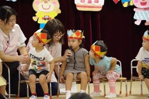 小さい友だちもマイクを向けられて緊張しながら好きな食べ物や自分の年を言うことが出来ました。