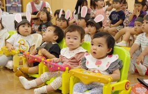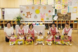 たぬきさんとうさぎさんの耳を付けて、歌を歌ったりお話を聞いたりしました。