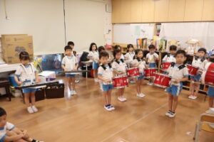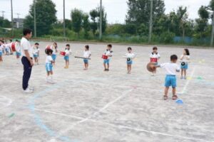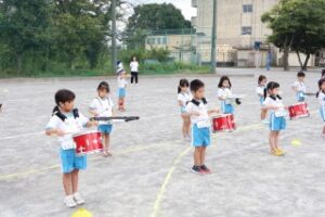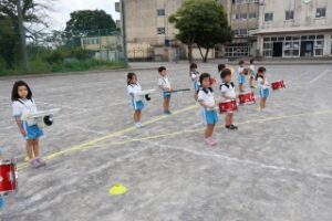 子どもたちは広いところから自分の立ち位置を覚えながら一生懸命練習しています。