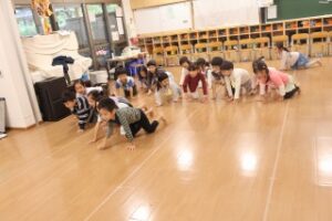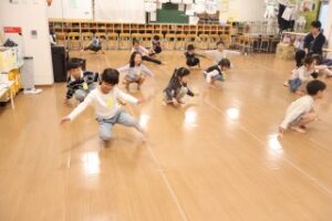 さすがは年長さん、みんなでピアノのリズムに合わせて体を動かしています。