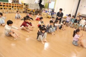 雨上がりだったので部屋で幼稚部合同のリズム遊びを行ないました。